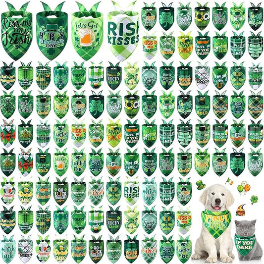 Sweetude 100 Pcs St Patrick's Day Plaid Dog Bandanas Bulk with Sayings Irish Pet Scarf Bibs Adjustable Washable Holiday Costume Accessories Grooming Supplies for Small to Large Cats Dogs