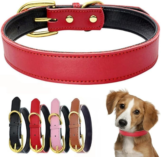 Dog Collars for Medium Dogs Leather, Soft Touch Padded Thick Genuine Cowhide Gold Buckle Durable Pet Cat Puppy Collars Adjustable for XS Small Medium Dogs, Red M