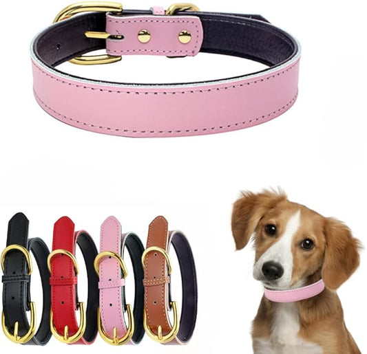 Leather Dog Collar for Dogs, Soft Touch Padded Thick Genuine Cowhide Gold Buckle Durable Pet Cat Puppy Collars Adjustable for XS Small Medium Dogs, Pink L