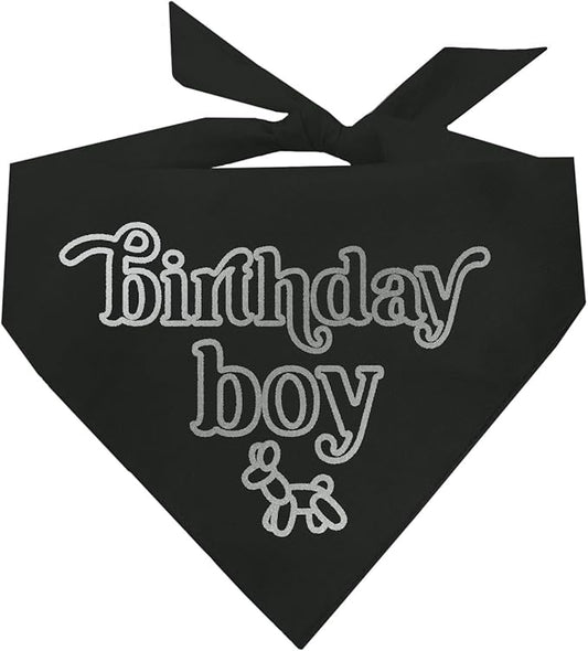 Birthday Boy Metallic Printed Dog Bandana | 100% Cotton Adjustable Triangle | Birthday Pawty | Party Theme | Celebration Supplies | Photoshoot Prop |Black, Silver Foil (1330)