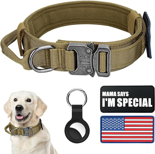 Tactical Dog Collar, Adjustable Nylon, Heavy Duty Metal Buckle with Handle, Airtag Protective Case, Brown, L, Medium & Large Breeds