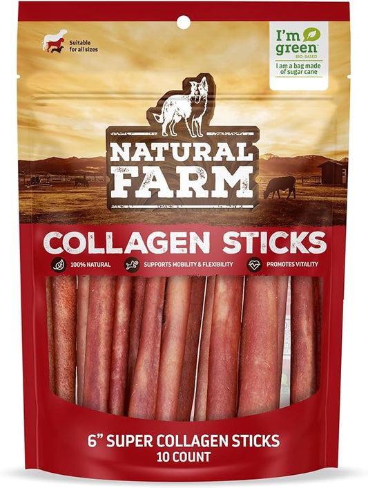 Natural Farm Odor-Free Super Collagen Dog Chews (6-Inch, 10-Pack) The First Ever Real Bull Sticks Alternative: 100% Natural Angus Hide Collagen Treats - More Protein, More Chew Time for All Dogs