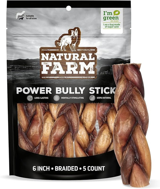 Natural Farm Braided Power Bully Sticks Dog Chews (6”, 5-Pack), 2-in-1 Power Chews: Premium Beef Cheek Wrapped in Beef Pizzle, Braided Together for a Very Long Lasting Chew, Great for Medium Dogs