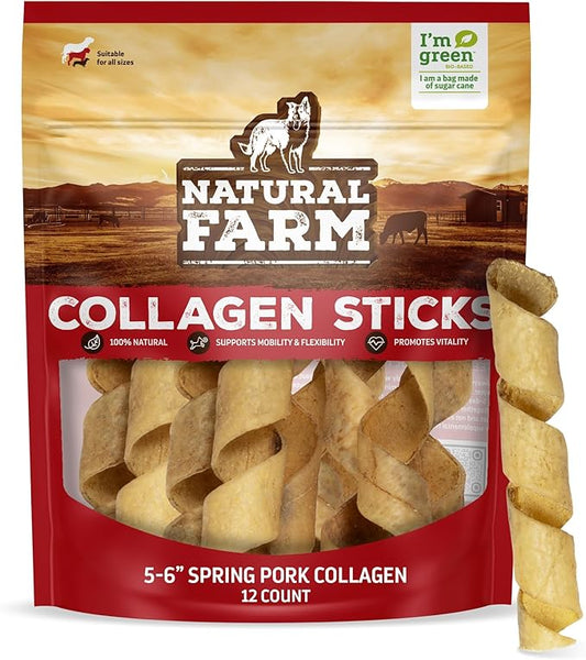 Natural Farm Curly Pork Collagen Sticks (5-6 Inch, 12 Pack), Fully Digestible & Natural Dog Chews, Flavorful & Long Lasting, Best for Small & Medium Chewers, Odor-Free Rawhide Alternative