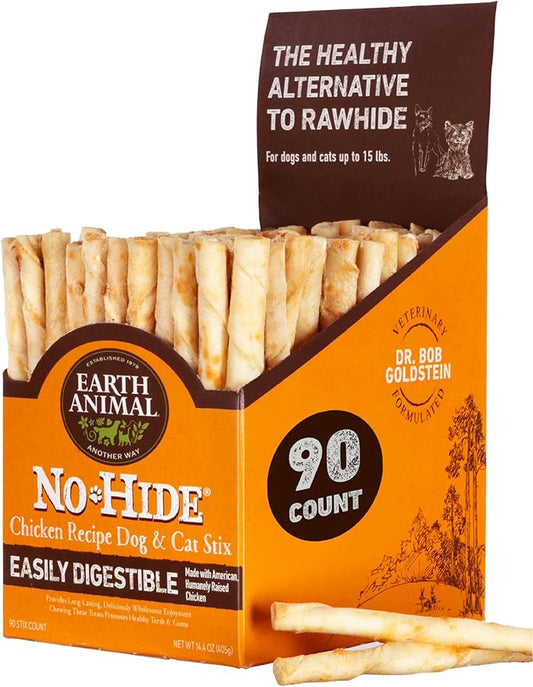 Earth Animal No Hide Stix Chicken Flavored Natural Rawhide Free Dog Chews Long Lasting Chew Sticks | Treats for Small Dogs and Cats | Great for Aggressive Chewers | 90 Count