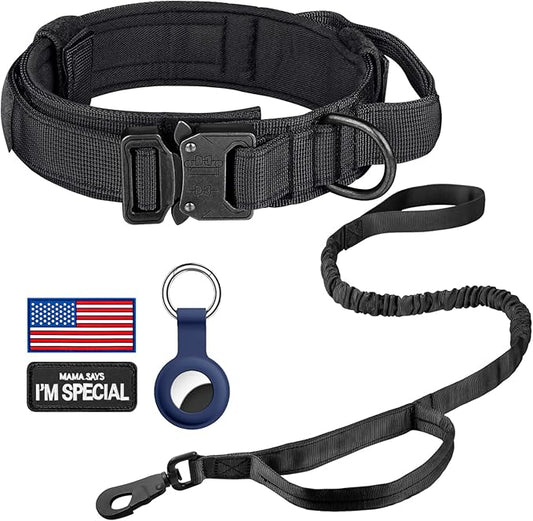 DAGANXI Tactical Dog Collar, Adjustable Military Training Nylon Dog Collar with Control Handle and Heavy Metal Buckle for Medium and Large Dogs, with Patches and Airtags Case (S, Black-Set)