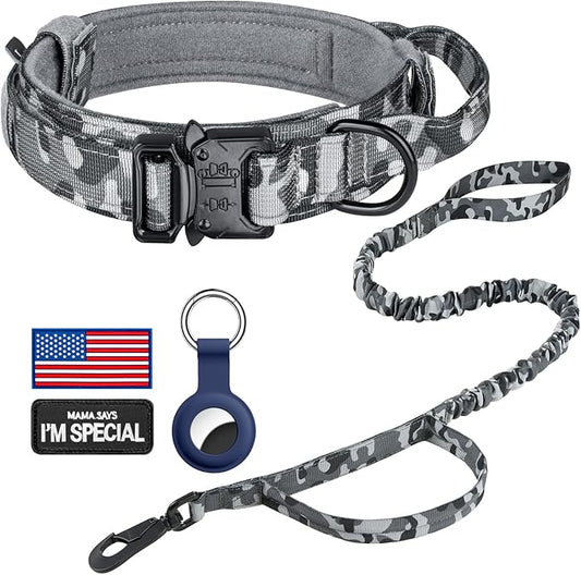DAGANXI Tactical Dog Collar, Adjustable Military Training Nylon Dog Collar with Control Handle and Heavy Metal Buckle for Medium and Large Dogs, with Patches and Airtags Case (L, Camo-Set)