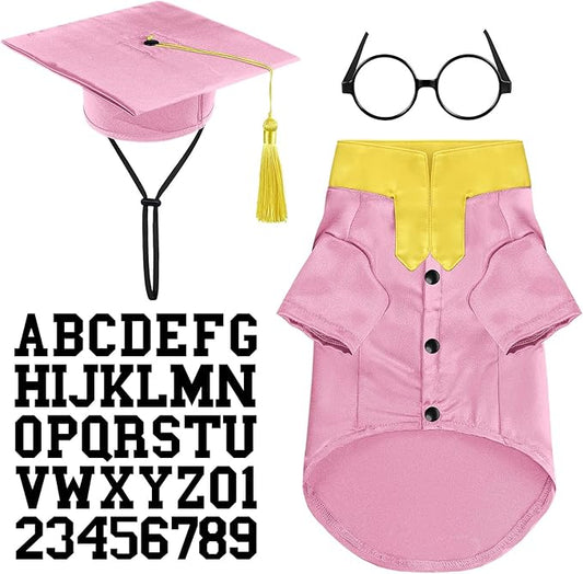 5 Pcs Dog Graduation Costume Set Include 2025 Pet Graduation Gown with Stole Puppy Grad Cap Lensless Glasses DIY Letter Stickers for Dogs Cats Holiday Costume Accessory(Pink Yellow,L)