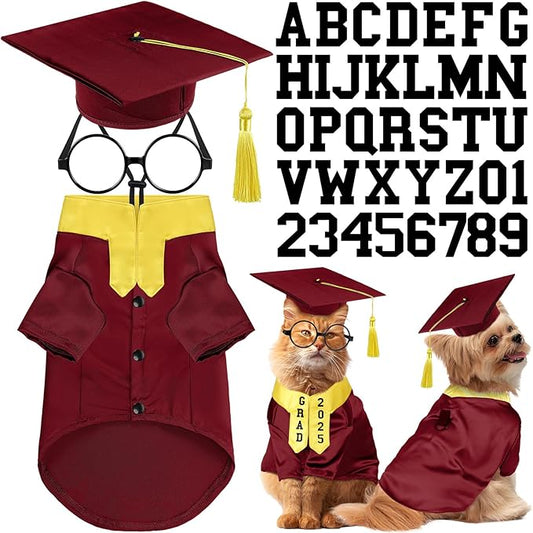 5 Pcs Dog Graduation Costume Set Include 2025 Pet Graduation Gown with Stole Puppy Grad Cap Lensless Glasses DIY Letter Stickers for Dogs Cats Holiday Costume Accessory(Maroon Yellow,S)