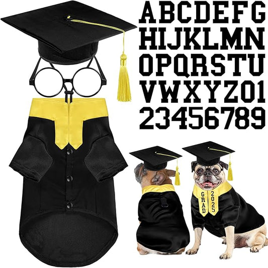 5 Pcs Dog Graduation Costume Set Include 2025 Pet Graduation Gown with Stole Puppy Grad Cap Lensless Glasses DIY Letter Stickers for Dogs Cats Holiday Costume Accessory(Black Yellow,XL)