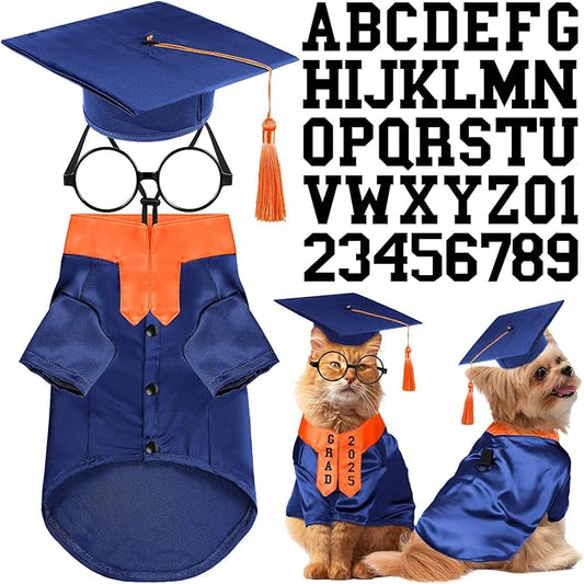 5 Pcs Dog Graduation Costume Set Include 2025 Pet Graduation Gown with Stole Puppy Grad Cap Lensless Glasses DIY Letter Stickers for Dogs Cats Holiday Costume Accessory(Blue Orange,S)