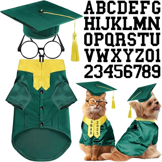 5 Pcs Dog Graduation Costume Set Include 2025 Pet Graduation Gown with Stole Puppy Grad Cap Lensless Glasses DIY Letter Stickers for Dogs Cats Holiday Costume Accessory(Green Yellow,S)