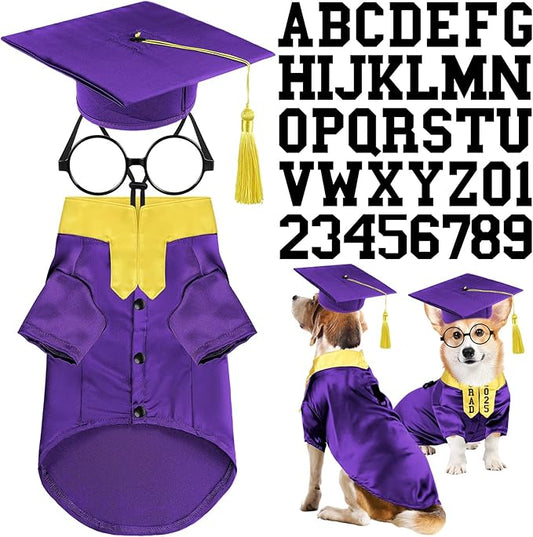 5 Pcs Dog Graduation Costume Set Include 2025 Pet Graduation Gown with Stole Puppy Grad Cap Lensless Glasses DIY Letter Stickers for Dogs Cats Holiday Costume Accessory(Purple Yellow,L)