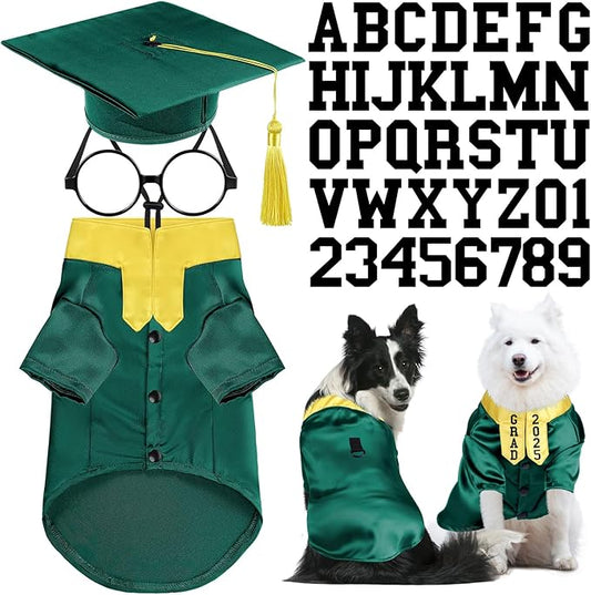 5 Pcs Dog Graduation Costume Set Include 2025 Pet Graduation Gown with Stole Puppy Grad Cap Lensless Glasses DIY Letter Stickers for Dogs Cats Holiday Costume Accessory(Green Yellow,XL)