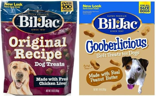 Bil-Jac Real Chicken Soft Treats for Dogs 2 Flavor Variety Bundle Original Recipe Liver Treats Gooberliscious Peanut Butter Flavor Treats, 10 Ounces Each (1 Bag of Each)