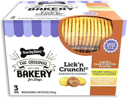 Three Dog Bakery Lick'n Crunch Sandwich Cookies Premium Dog Treats with No Artificial Flavors, Carob/Peanut Butter, Golden/Vanilla, 39 Ounces (Pack of 1)