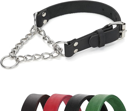 Martingale Collar for Dogs No-Pull Adjustable Training Collar with Stainless Steel Chain - Genuine Leather Anti-Slip Design for Small,Medium,Large Breed Dogs - Black (S)