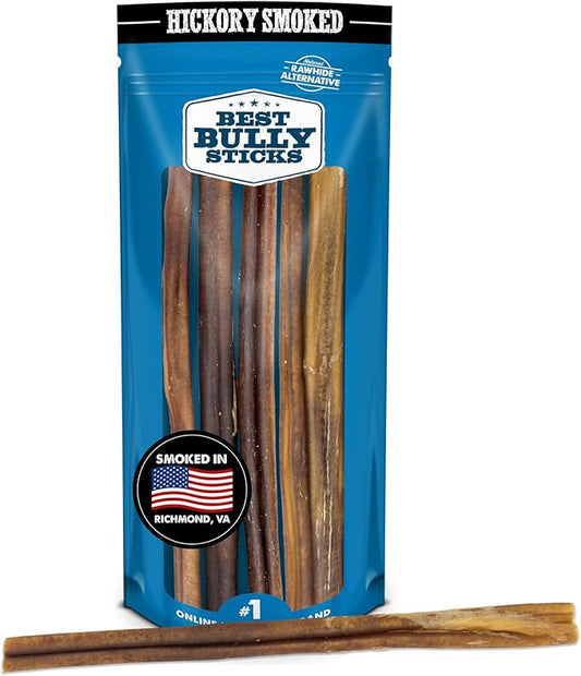 Best Bully Sticks Hickory Smoked Thick 12 Inch Bully Sticks - 5 Count (Pack of 1) - Natural, Grain and Odor-Free, Smoky Aroma, No Additives, Grass-Fed