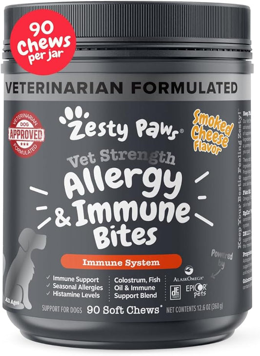 Zesty Paws Vet Strength Dog Allergy Relief Chews, Dog Probiotics for Itchy Skin and Ears, Smoked Cheese, 90ct
