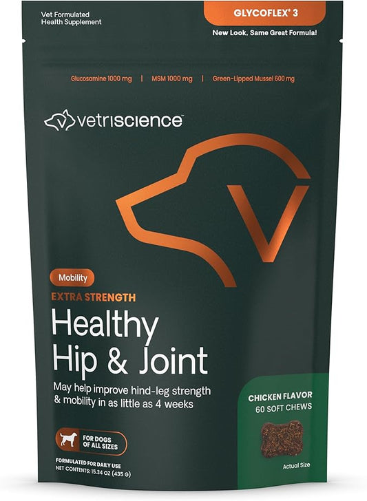 VETRISCIENCE Extra Strength Healthy Hip & Joint Chews, GlycoFlex Glucosamine and Green Lipped Mussels for Dogs, Promote Mobility and Soothe Joint Discomfort, Chicken, 60 Count