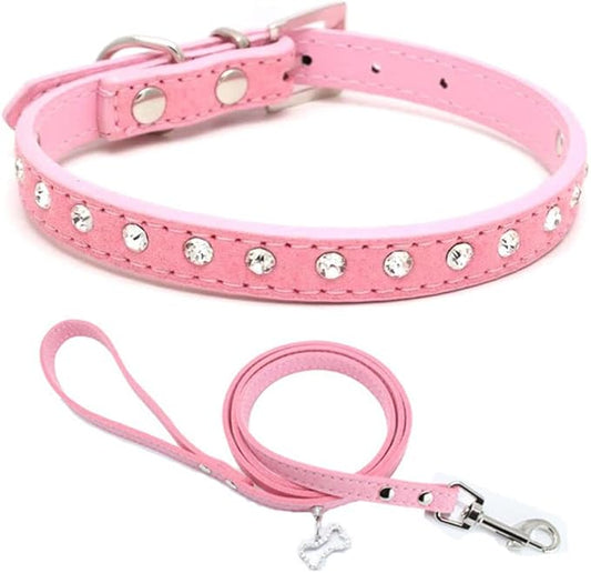 Puppy Collar and Leash with Bling Diamond, Pretty Crystal Sparkly Rhinestone Glitter Jewel Girls Cat Collars for XXS Xs Small Medium Pet Female Dogs Boys Kitten, Pink XXSmall