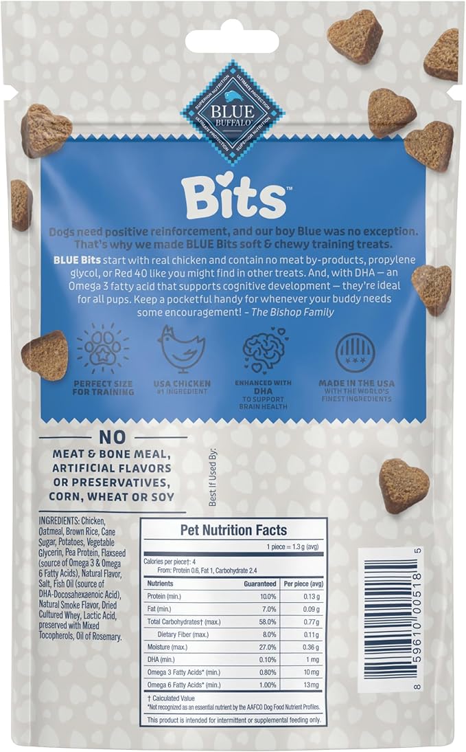 - Contains: One (1) 4-oz bag of BLUE Bits Natural Soft-Moist Training Dog Treats, Chicken Recipe