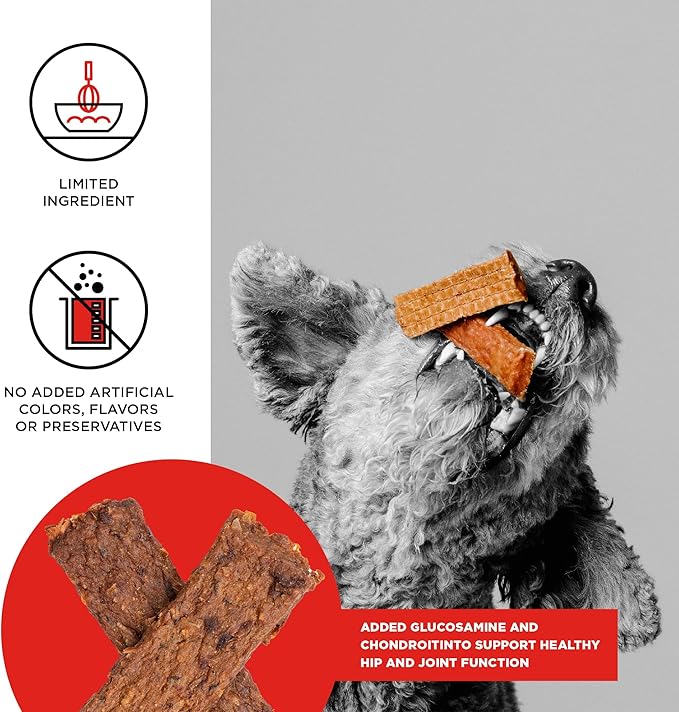 - SUPPORTS HEALTHY HIPS & JOINTS: Made with glucosamine and chondroitin from natural sources; Each dog jerky stick contains approximately 34 mg of glucosamine (2,400 mg/kg) and 17 mg of chondroitin (1,200 mg/kg) to help support and maintain joint function