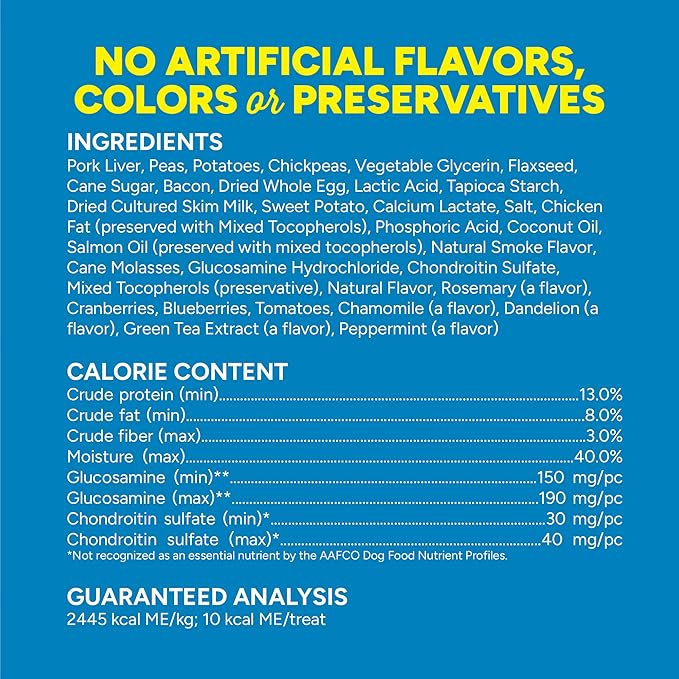 - Soft-textured treats with a daily measured dose of supplementation for your dog’s weight
