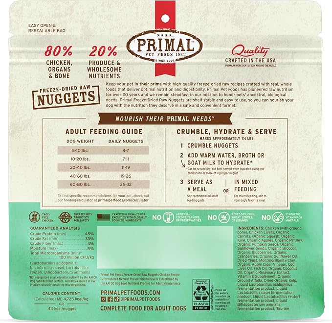 Primal Freeze Dried Raw Dog Food Nuggets, Chicken, Complete & Balanced Meal, Also Use as Topper or Treat, Premium, Healthy, Grain Free, High Protein Raw Dog Food, 5.5 oz
