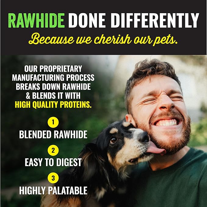 - Blended Rawhide – Our proprietary manufacturing process breaks down rawhide and blends it with protein.