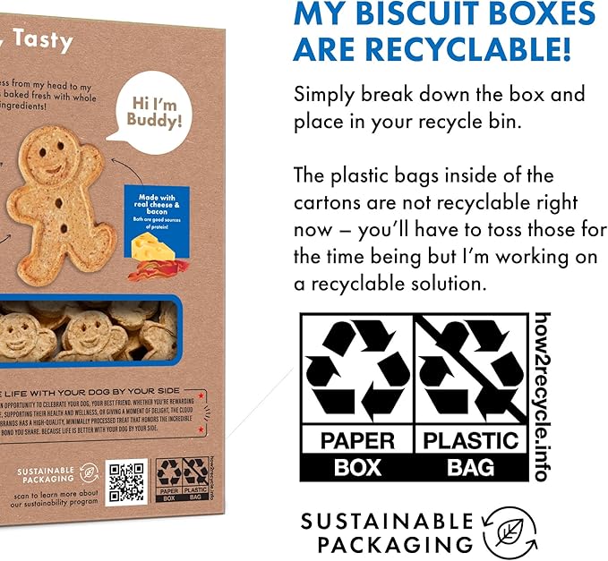 - RECYCLABLE: After your pup has enjoyed their delicous treats, simply throw away the empty plastic bag, and you can recycle Buddy's cardboard carton!