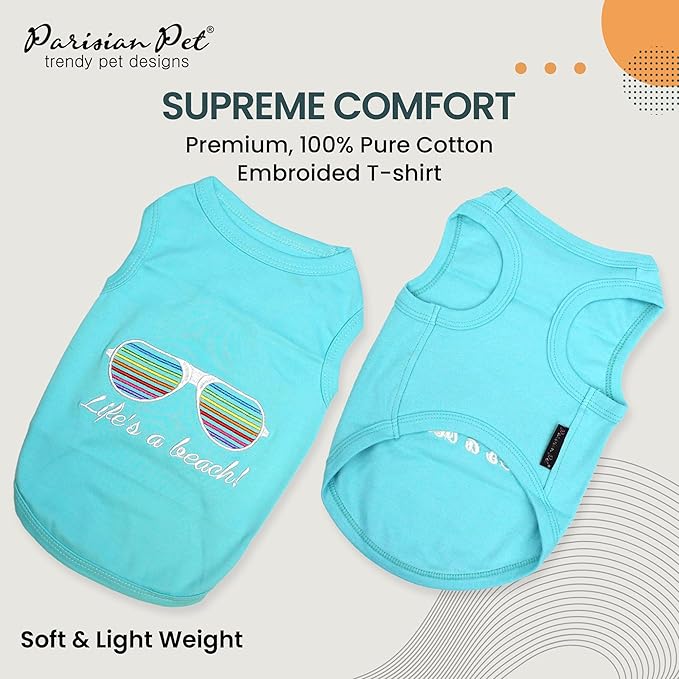- [ EMBROIDED SHIRTS FOR DOG ] - Bring a touch of the tropics to your dog's wardrobe with this stylish dog tshirt featuring the embroidered phrase "Life’s a Beach" alongside a colorful sunglasses . This dog tee shirt ensures a comfortable and snug fit for your furry friend, making it perfect for beach outings, summer adventures, or everyday wear. celebrating your pet's fun-loving spirit and spreading joyful, island vibes wherever you go.