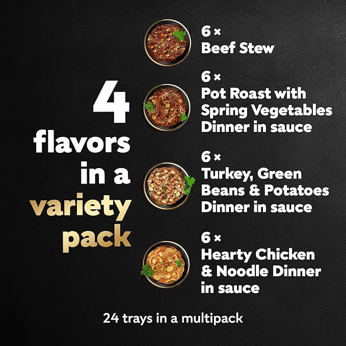 - 24-Pack: Contains six (6) 3.5 oz. packs of Cesar Home Delights Adult Wet Dog Food Pot Roast with Spring Vegetables Dinner in Sauce, and six (6) 3.5 oz. packs of Cesar Home Delights Adult Wet Dog Food Beef Stew, and six (6) 3.5 oz. packs of Cesar Home Delights Adult Wet Dog Food Turkey, Green Beans, & Potatoes Dinner in Sauce, and six (6) 3.5 oz. packs of Cesar Home Delights Adult Wet Dog Food Hearty Chicken & Noodle Dinner in Sauce