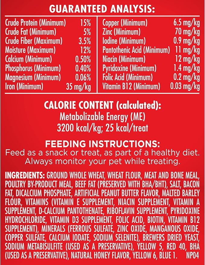 - Contains one (1) seven (7) pound box of naturally and artificially flavored dog biscuits in three (3) flavors: Peanut Butter, Peanut Butter & Bacon, and Peanut Butter & Honey (packaging may vary)