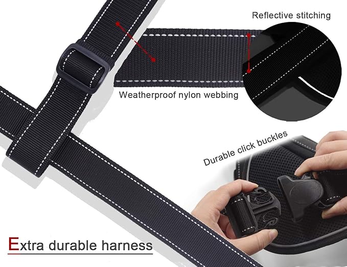 - EXTRA DURABLE HARNESS - Fit dogs with 32-47 inch chest (Measure the widest part of the dog's chest, choose the larger size if fall between two sizes). Made with super durable Nylon, wear resistant and weatherproof. 450 lb pulling resistance. Ideal for hard pullers dogs.