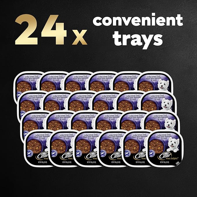 - 24-Pack: Contains twenty-four (24) 3.5 oz. packs of CESAR HOME DELIGHTS Adult Wet Dog Food Grilled Ribeye Steak Flavor with Vegetables in Sauce