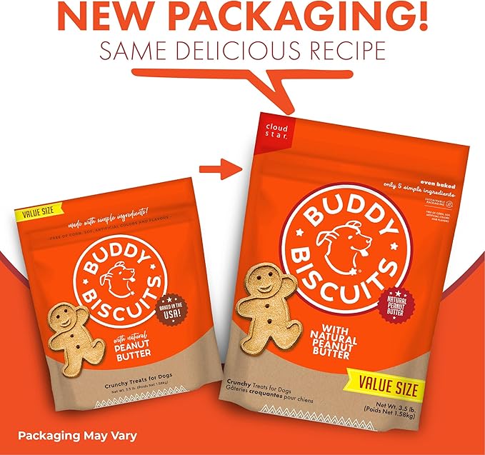 - BUDDY BISCUITS: Contains ONE 3.5 lb value size bag of whole grain Buddy Biscuits. These adorable, crunchy biscuits are the perfect treat for medium to large dogs - but enjoyed by dogs of all sizes and all ages.
