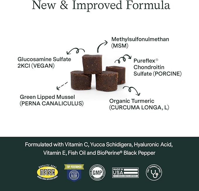 - Veterinarian formulated: Dog joint and hip supplement crafted by our Co-Founder, Veterinarian Dr. Dulake; our hip and joint for dogs bears the NASC quality seal, is made in the USA, GMP-compliant, and does not contain colors, dyes or preservatives