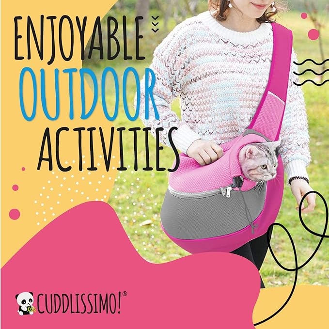 - š¶ PERFECT FOR SMALL PETS - Cuddlissimo! pet sling carrier is designed for small and teacup dogs or cats, up to 6 pounds in weight. This dog sling has a padded bottom, and the neck opening is fully adjustable.