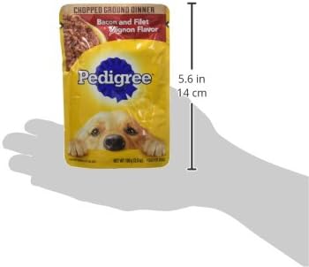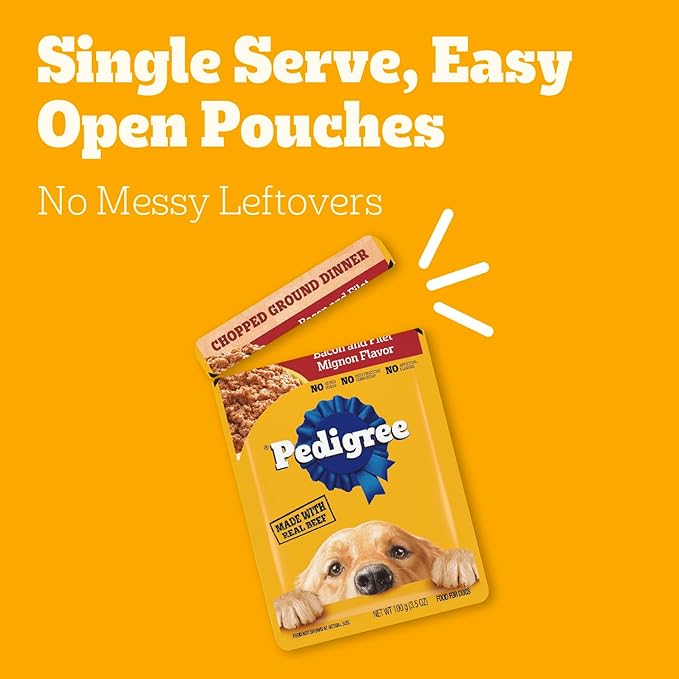 - CONTAINS SIXTEEN (16) 3.5 oz. pouches of PEDIGREE CHOPPED GROUND DINNER Wet Dog Food in Bacon and Filet Mignon Flavor