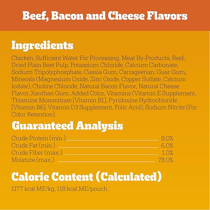 - 18-Count: Pedigree Chopped Ground Dinner Adult Wet Dog Food Cheese Variety Pack contains six (6) 3.5 oz. Pouches of With Hearty Chicken, six (6) With Slow Cooked Beef, and six (6) Beef, Bacon and Cheese Flavors