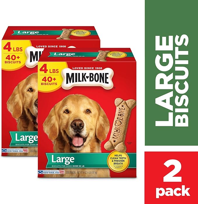 - Contains two (2) 4 pound boxes of large dog biscuits