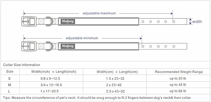 - All pictures are taken with our production samples from a size of Width 3/4", Neck 13-16.5". Please measure your pets carefully for making the right purchase. Always look at the size chart for the recommended weight range to confirm the size