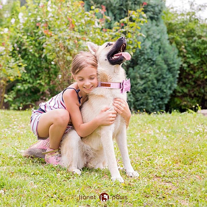 Lionet Paws Dog Collar with Bowtie, Comfortable Adjustable Cute Pink Gingham Bow Tie Collar for Female Dogs Gift, Medium, Neck 13.5-22 inches