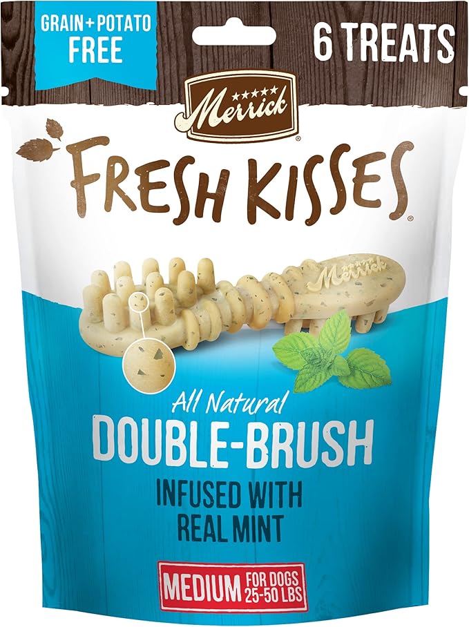 - Merrick Fresh Kisses Infused With Real Mint, Natural Toothbrush-Shaped Dental Dog Chews For Medium Dogs Weighing 25 to 50 Lbs