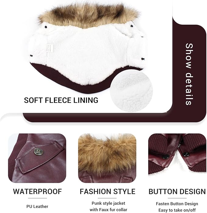 - Ultra Warm for Winter: Double layer leather dog jacket for winter, windproof outer PU fabric with furry fleece lining, doggies will love the softness of the wrap, keep them warm and comfortable from outside cold weather.