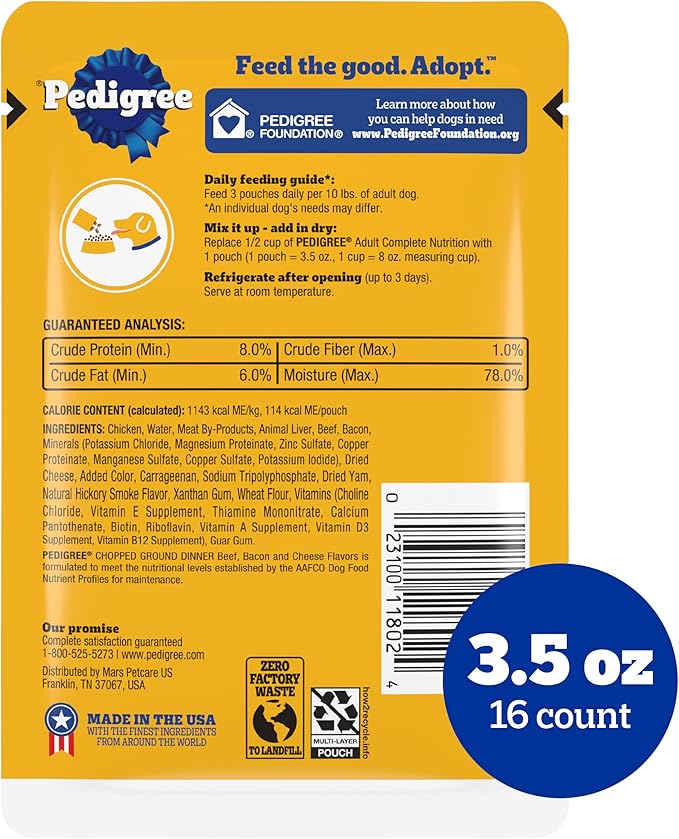 - Contains sixteen (16) 3.5 oz. Pouches of Pedigree Chopped Ground Dinner Dog Food, Beef, Bacon and Cheese Flavor.