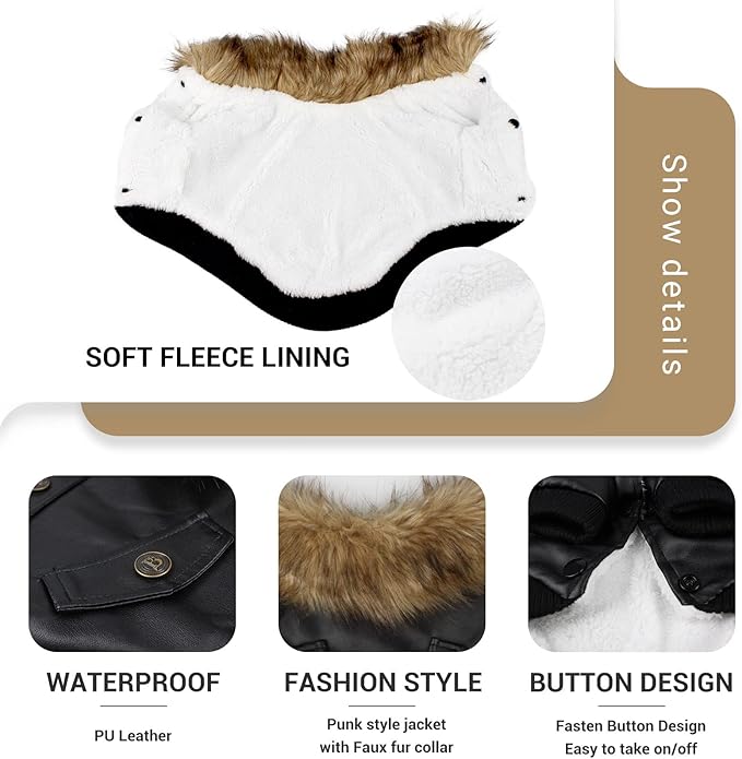 - Ultra Warm for Winter: Double layer leather dog jacket for winter, windproof outer PU fabric with furry fleece lining, doggies will love the softness of the wrap, keep them warm and comfortable from outside cold weather.