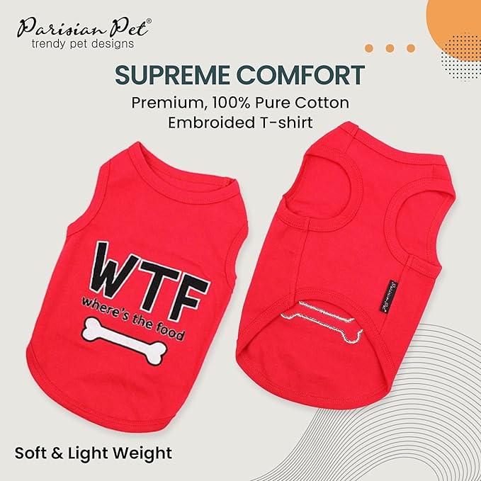 Parisian Pet Dog Tshirt - Embroidered “ WTF (Where’s The Food) “ Dog Shirt - Lightweight, Cotton Tank Top - Sleeveless Tee Shirts - Machine Washable Shirts for Small Dogs - XXS