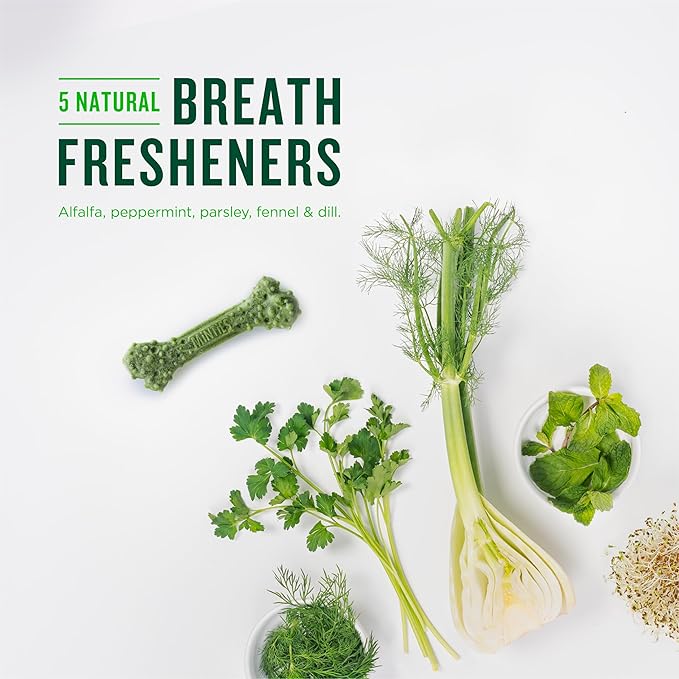 - Promote Good Dog Oral Health: Using Minties dog dental chews daily helps promote oral health and freshens your dog's breath with five (5) breath fresheners alfalfa, parsley, fennel dill, and peppermint